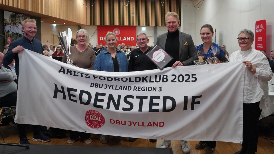 image Hedensted IF er kåret til Årets Fodboldklub 2025 i DBU Jylland Region 3. Prisen blev overrakt af formand Claus Warming (yderst tv.) og Anita Schytte (yderst th.) fra regionsbestyrelsen. Foto: Marie Lauridsen, DBU Jylland Kommunikation